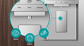 The automatic volumetric water dispenser ensures you stay refreshed by allowing you to choose from specific amounts - 150ml, 500ml, or continuous flow - tailored to your hydration needs at any time.