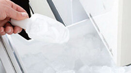 There is no need for a separate plumbing connection on this Mitsubishi fridge. A removable water tank can be filled with water and all of the parts are completely washable for ice whenever you need it.