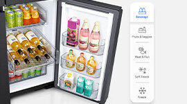The clever door-in-door design allows quick access to a handy and hygienic Beverage Centre including the 1.4L auto-fill water jug, water dispenser and drinks storage - providing function without the mess.