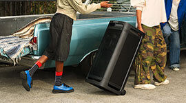 Take the party anywhere effortlessly. Large built-in wheels and a convenient handle allow you to transport the speaker with ease, so you can set up your sound anywhere you like.