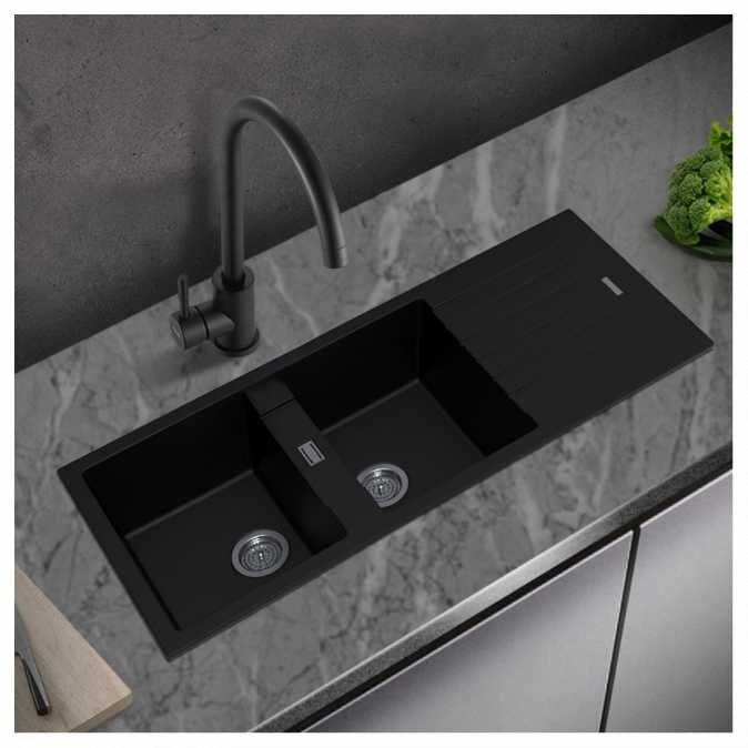 | Features | Dual-Bowl Versatility: The spacious double bowl configuration allows for multitasking—wash, rinse, and prep simultaneously—boosting kitchen productivity without compromising space. Premium Granitek Material: Constructed with a quartz-rich composite, Granitek ensures high resistance to heat, scratches, and impact while showcasing a refined stone-like aesthetic. Elegant Stone-Look Finish: The natural stone appearance adds a touch of timeless luxury, blending seamlessly with both contemporary and classic kitchen styles. Ultra-Textured Surface: The tactile finish enhances the sensory experience while providing better scratch concealment and increased grip when handling dishes. Thermal Shock Resistance: Engineered to withstand sudden temperature changes, the sink remains stable and crack-resistant during extreme hot or cold water exposure. Integrated Drainage System: Designed with a built-in drain to optimize water flow, minimize pooling, and maintain a clean, clutter-free countertop. |