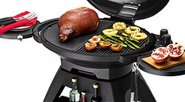 Grill with the hood up for classic barbecuing or down for roasting. The spring-assist hood provides smooth operation, while the integrated thermometer and enamelled cast iron surface let you cater to intimate meals or large gatherings with ease.