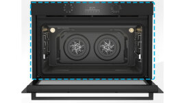 Dual fans distribute heat evenly throughout the spacious cavity, ensuring faster cooking times and consistent results across all shelves, even when preparing multiple dishes at once.