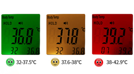 When the taken temperature measures between 37.5C~38.4C, the unit will emit an orange backlight and three short beeps to alert you. When the measurement exceeds 38.5C, the backlight will turn red and emit beeps to alarm you of a potential fever.