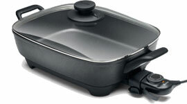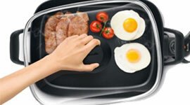 | Features | Pan tilt lever creates a slope to drain fats and juices Precise Temperature Control (Keep Warm, Saute, Pan Fry and Sear settings) Cast aluminium with dishwasher safe toughened glass lid Adjustable steam vent Premium PFOA-free non-stick cooking surface 38 x 29.5cm rectangular extra deep 7.8cm fry pan Non-skid rubber feet Cool touch handles |