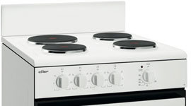 Mounted with a small splashback, this cooker features front-controls positioned safely and well away from the reach of inquisitive little fingers. Whether simmering, frying or boiling, 4 variably-sized solid element cooking zones offer plenty of cooking flexibility.