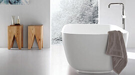 The Skye bath’s elongated oval shape and tapered profile create a striking silhouette that feels both fluid and architectural. Designed to stand freely within the space, it offers a sense of lightness and presence, anchoring the bathroom with quiet confidence.