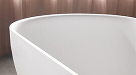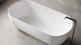Cast from Claybrook’s exclusive MarbleForm and hand-finished to a smooth matte texture, the Skye bath combines the elegance of natural stone with lasting resilience. Its seamless surface is tactile, durable, and easy to care for — ideal for daily use and long-term enjoyment.