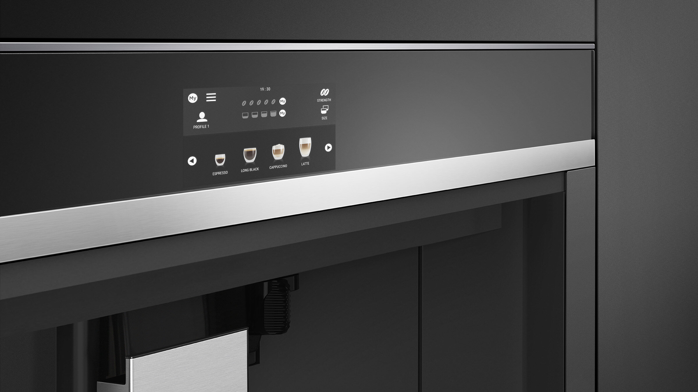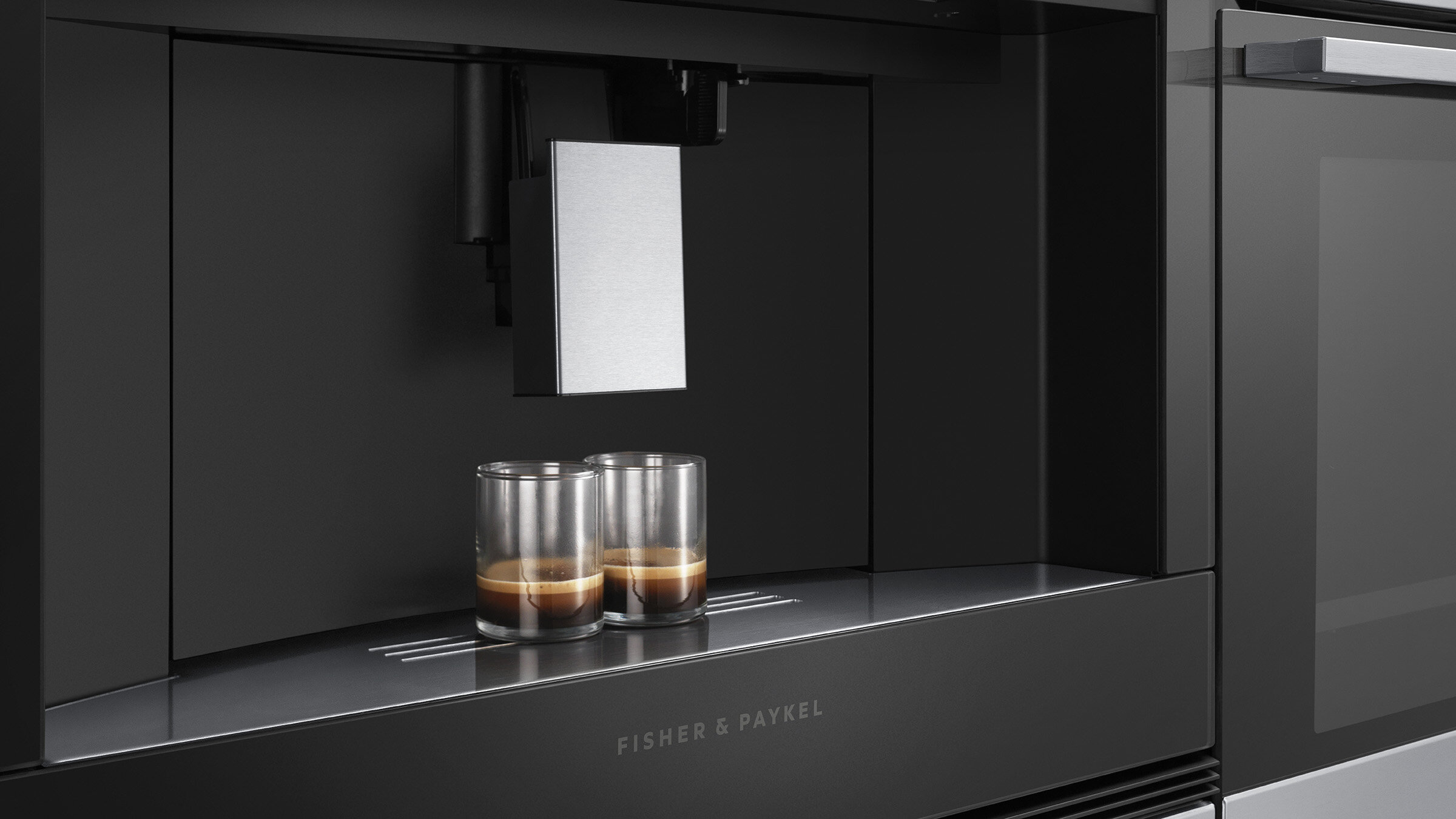 Finished in black reflective glass with a polished metal trim, this coffee machine will look right at home among the other appliances in the Fisher & Paykel family.