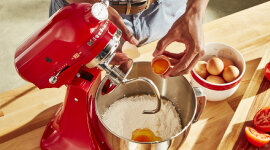 The KitchenAid mixing head easily tilts back, allowing unobstructed access when you need to add more ingredients or when changing accessories. The unit’s interlock mechanism secures the head in place, meaning you can give your hands a rest and let the mixer work its magic.