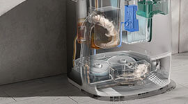 The intelligent base station quietly empties the dustbin, washes and dries the mops with hot water, and stores debris for up to four months—minimizing maintenance and maximizing hygiene.