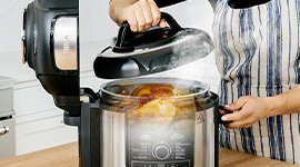 Comes with two separate cooking lids. The Pressure Lid for slow cooking, pressure cooking, sautéing, and steaming, and the Crisping Lid for air frying, baking, roasting, and grilling.