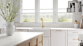 The bold square-profile gooseneck creates a strong architectural statement while providing generous clearance for filling pots and washing large cookware.