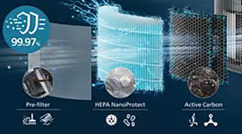 Captures 99.97% of particles, allergens, viruses, and gas pollutants as small as 0.003 microns, ensuring exceptionally pure and healthy indoor air.