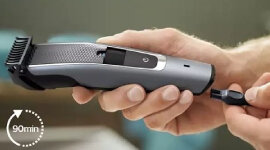Charge your beard trimmer for 1 hour to get up to 90 minutes of cordless use, or simply use it plugged into the wall. Alternatively, the quick charge function gives you a full trim after just 5 minutes of charging.