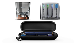 Place your toothbrush into the sleek glass holder and it will start charging instantly. The spare brush heads are hygienically and neatly stored in the handy case, plus the deluxe travel case doubles as a charger.