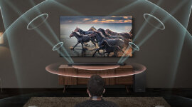 Mixing and outputting sound so it appears to emerge from where the action is on screen, Acoustic Beam technology consists of up-firing drivers, directing sound through an Acoustic Beam. The beams themselves contain holes of different sizes to project different sound frequencies across a wider area, for heightened audio.