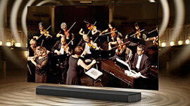 Syncing the Samsung soundbar with a compatible Samsung TV, Q-Symphony incorporates the sound from both TV and soundbar into a blended surround sound experience.