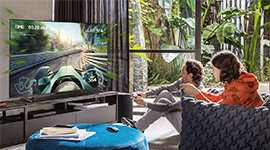Dolby Atmos technology creates a 360° audio field above and around you. Conventional Soundbars shoot audio directly at you and that creates a two-dimensional sound experience. With Dolby Atmos, the upwards firing speakers send sounds to the roof, which then bounce down on top of you and immerse you in audio from above.