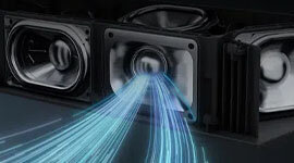 Experience true cinematic audio with five main channels, two up-firing speakers, and a powerful wireless subwoofer delivering enveloping, room-filling sound from every angle—even overhead.