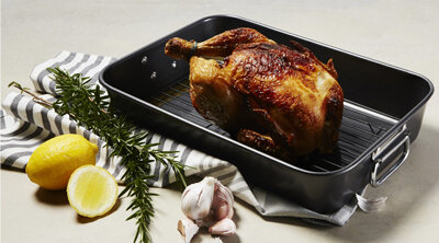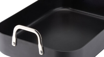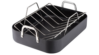 The hard anodised construction ensures this roaster will last a long time. Additionally, this roaster is equipped with sturdy handles to ensure safe handling when putting the roaster in and out of the oven.