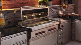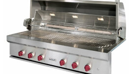| Features | ● Three individually contained grill burners - Provide the precise, independent heat control for more predictably delicous results – sear steaks or fish on high heat while side dishes grill on lower heat. ● Heavy-duty stainless steel construction - Sculpted in double-wall stainless steel and heli-arc welded for seamless strength, the Wolf grill may be the last one you'll ever need to buy. ● Rigorously tested to ensure dependability - Each and every Wolf appliance is rigorously stress-tested to perform for over twenty years of daily use and is backed by the strongest warranty in the industry. ● Halogen lights for night-time grilling - Powerful halogen lights illuminate the grilling surface, and control knobs are LED-lit – the perfect set-up for night-time grilling. ● Double-wall hood front - Provides insulation and helps hold in heat for more efficient grilling. ● Three-position warming rack - Adjusts easily for the temperature you want, and stows away when not in use. ● Two types of heat for more thorough grilling - Two types of heat – direct and radiant from ceramic briquettes – give you nuanced control for everything from seared steaks to grilled fruit to smoked trout. ● Two-position rotisserie system - Rotates chicken, pork and more in front of an infrared burner for even cooking and a more juicy taste. Maximum load 11 kg. ● Electric hot surface ignitors - Provide safe, reliable ignition without the need for a pilot. ● Easy-opening hood - Hood assist system with concealed springs make opening and closing easy. ● Stainless steel burner grates - Provide more heat contact for even grilling. Grill Specifications ● 2 - 29 MJ Burners ● 1 - 15 MJ Rotisserie Burner |