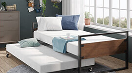 Internal steel framework and sturdy wooden slats offer robust mattress support and eliminate the need for a box spring.